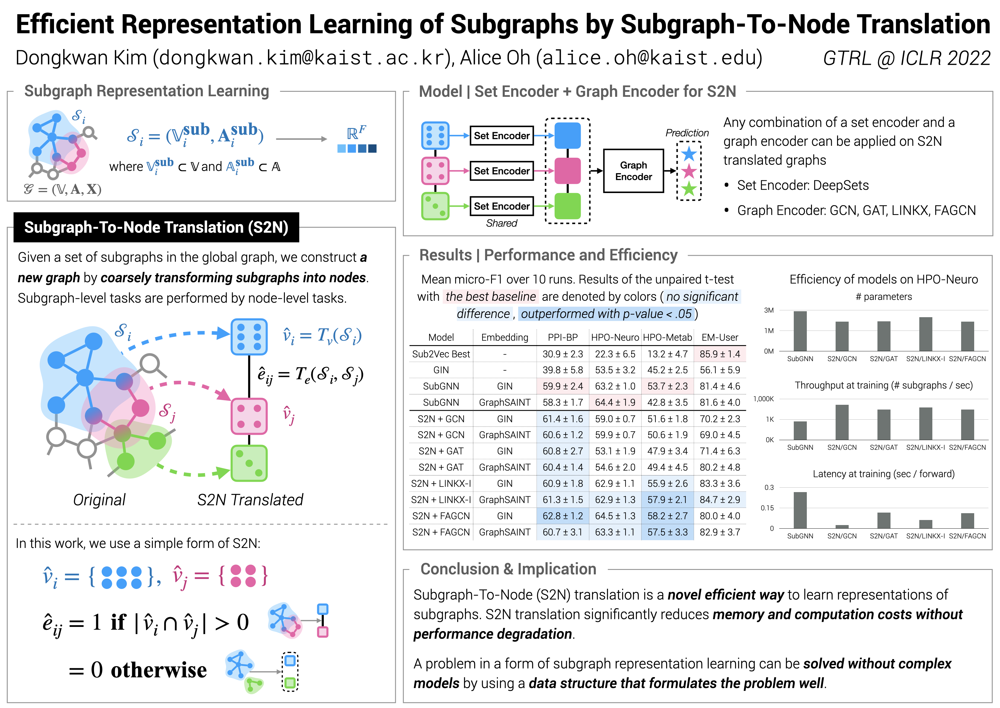 A subgraph is a data structure that can represent various real-world problems. We propose Subgraph-To-Node (S2N) translation, which is a novel formulation to efficiently learn representations of subgraphs. Specifically, given a set of subgraphs in the global graph, we construct a new graph by coarsely transforming subgraphs into nodes. We perform subgraph-level tasks as node-level tasks through this translation. By doing so, we can significantly reduce the memory and computational costs in both training and inference. We conduct experiments on four real-world datasets to evaluate performance and efficiency. Our experiments demonstrate that models with S2N translation are more efficient than state-of-the-art models without substantial performance decrease.